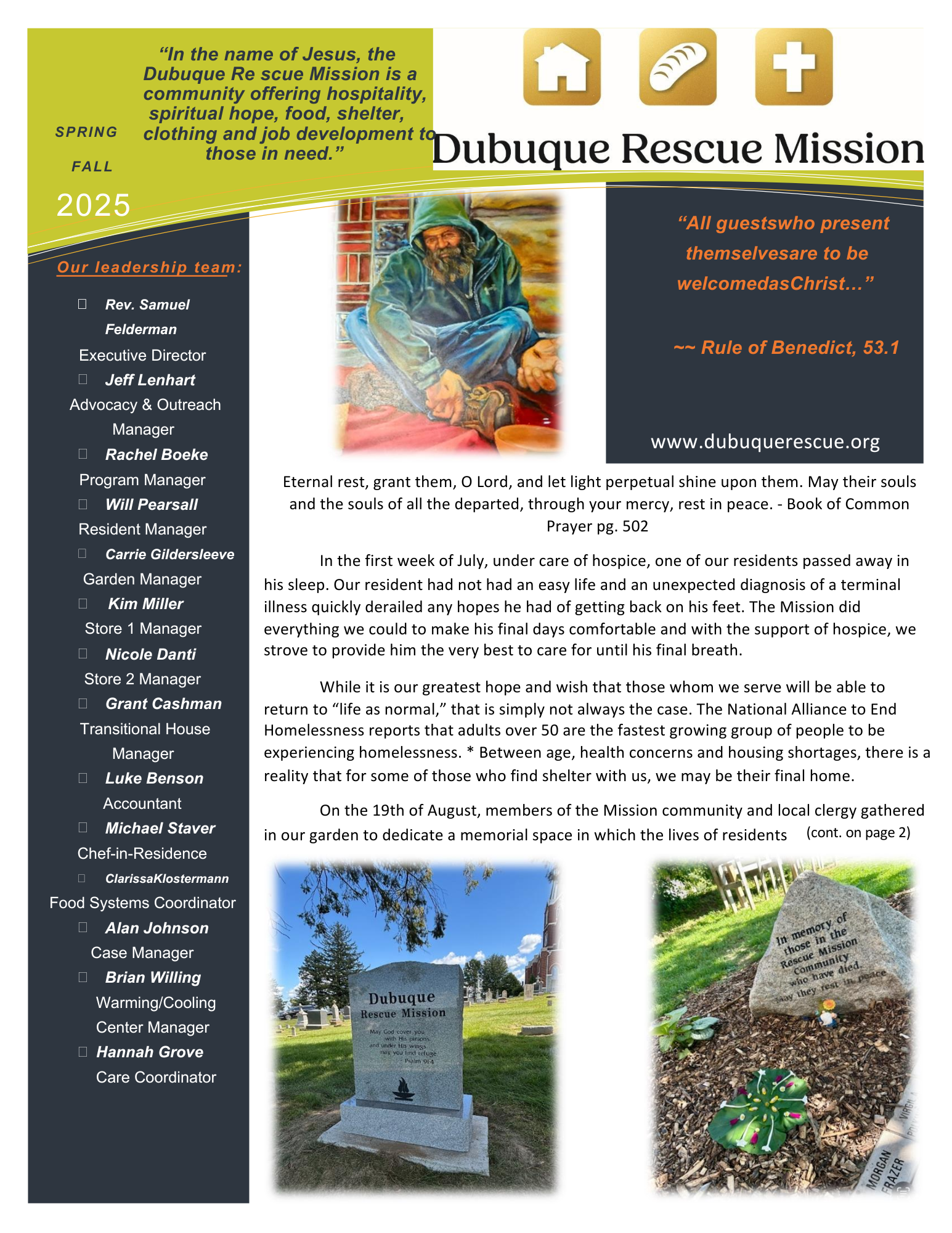 In the name of Jesus, the Dubuque Rescue Mission is a community offering hospitality, spiritual hope, food, shelter, clothing, and job development to those in need.